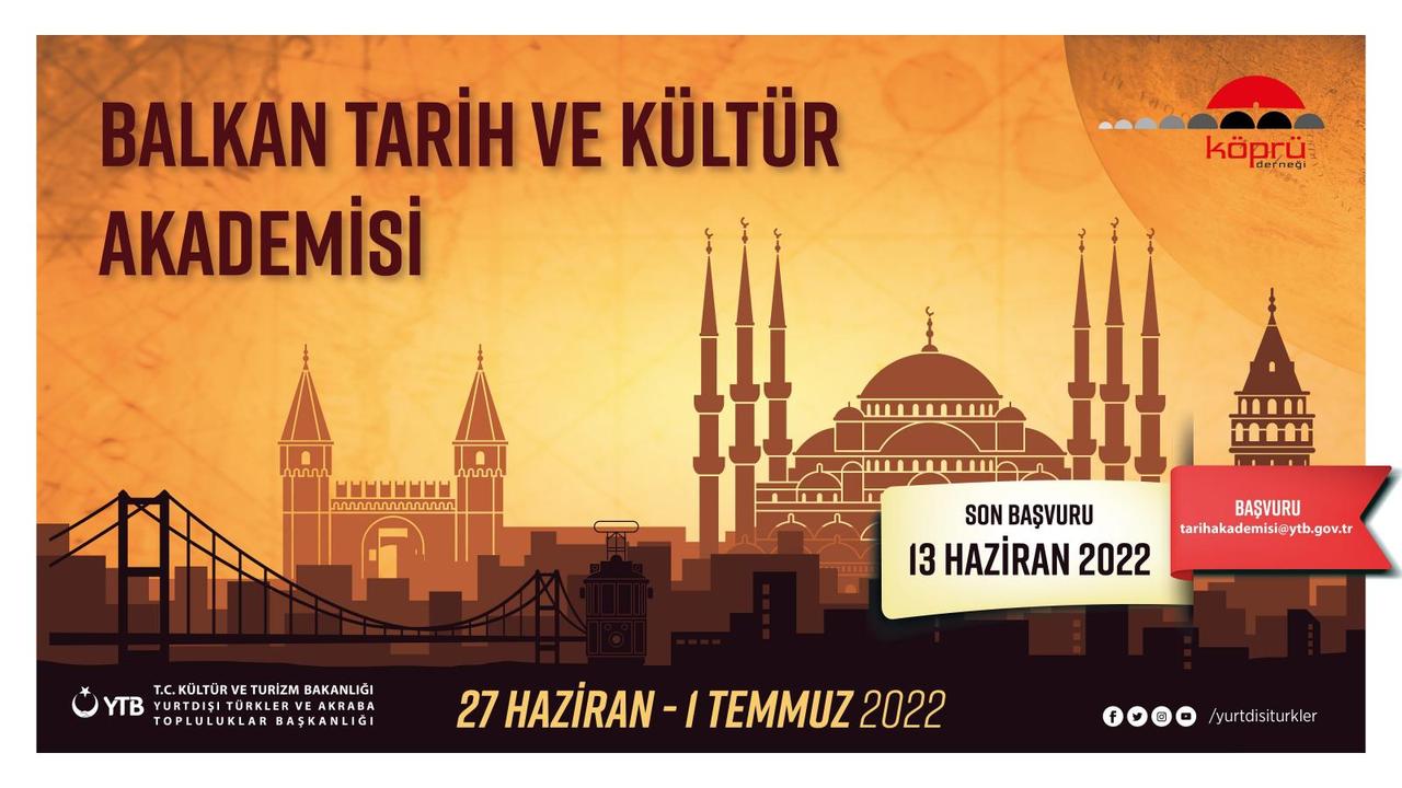 Balkan Tarih ve Kültür Akademisi, Balkanlarda bulunan soydaş ve akraba topluluk mensubu gençlerimizin kültür, sanat ve tarih birikimlerine katkı sağlamak amacıyla düzenlenmektedir. Program Kuzey Makedonya’nın Ohri şehrinde 27 Haziran - 1 Temmuz 2022 tarihleri arasında ve Türkçe gerçekleştirilecektir. Programdan 30 katılımcı faydalanacak, katılımcıların konaklama ve ulaşım giderleri karşılanacak, program sonunda katılımcılara sertifika verilecektir. Katılımcılar, Başkanlık tarafından yapılacak değerlendirmenin ardından seçilerek programa davet edilecektir.
